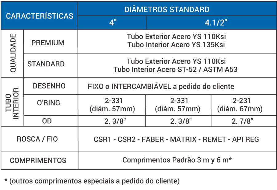 Construído com tubo de aço carbonado ou aço ligado tratado termicamente, caso se trate de Barras de qualidade Standard ou Premium.