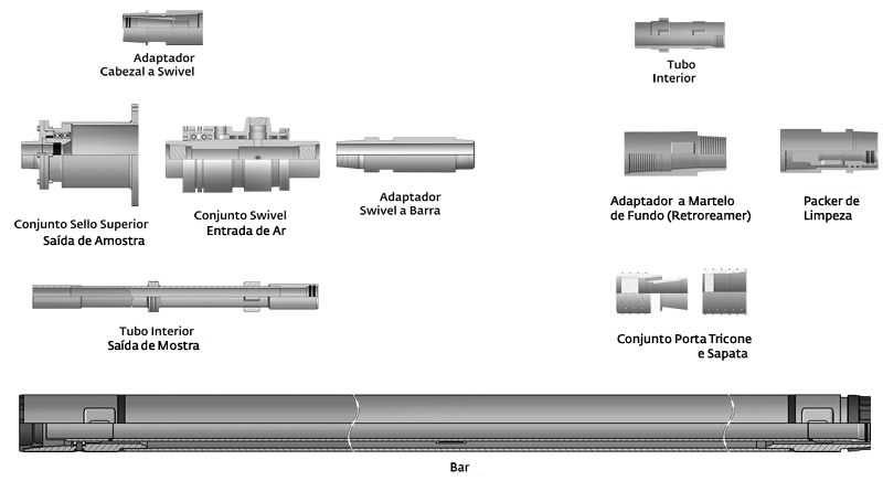 Tassaroli S.A.complementa a oferta de Barras com uma linha de acessórios que permite integrar o sistema de coluna de perfuração de Ar Reverso desde o cabeçal até o tricone e/ou martelo.