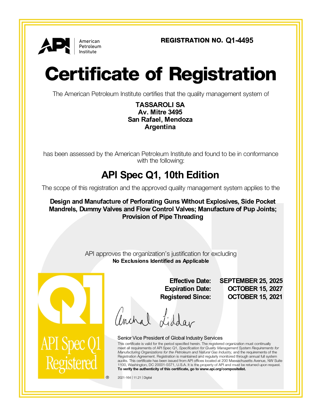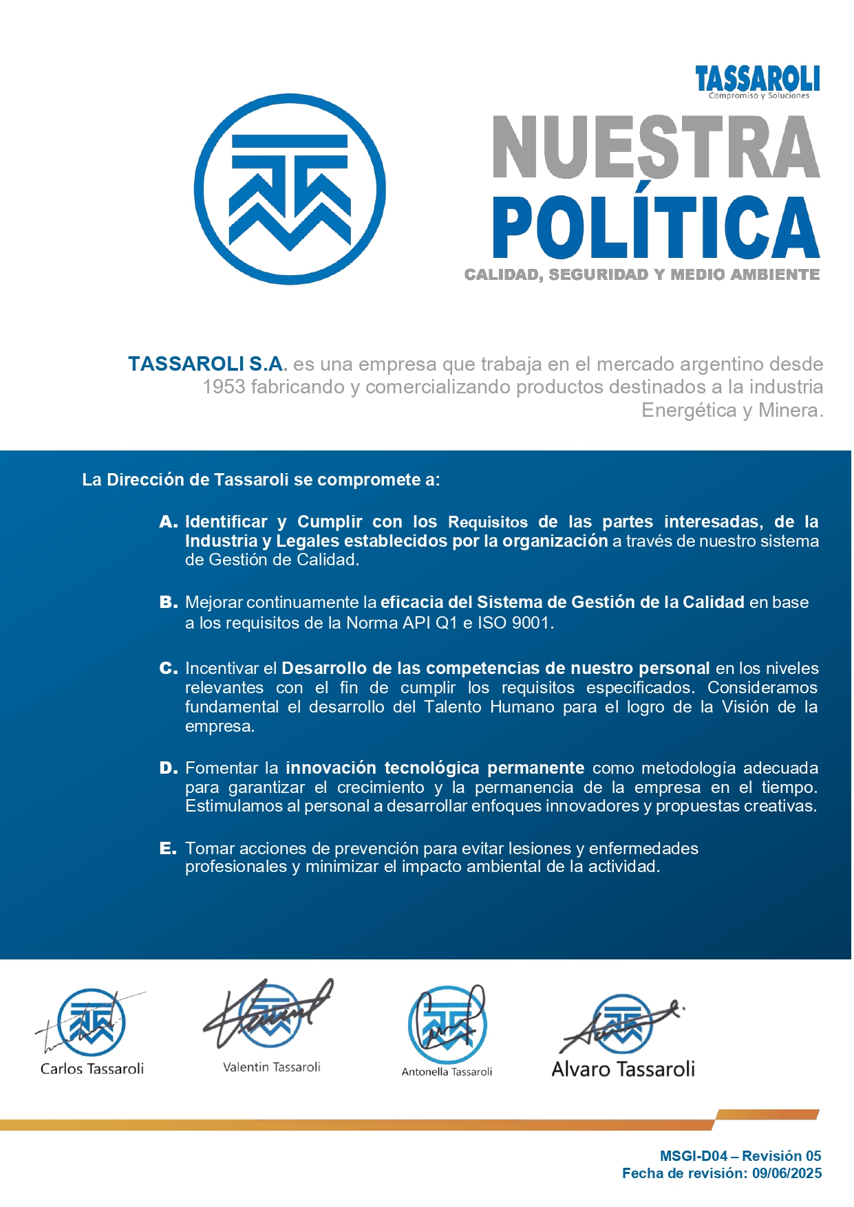 Desde 1997 TASSAROLI trabaja en el marco de normas Internaciones de Gestión de la Calidad, contando actualmente con un Sistema de Gestion de Calidad certificado bajos las normas ISO 9001:2015 y API Spec Q1, que demuestran el compromiso permanente de brindar productos y servicios de calidad, confiables e innovadores que agreguen valor a nuestros clientes.